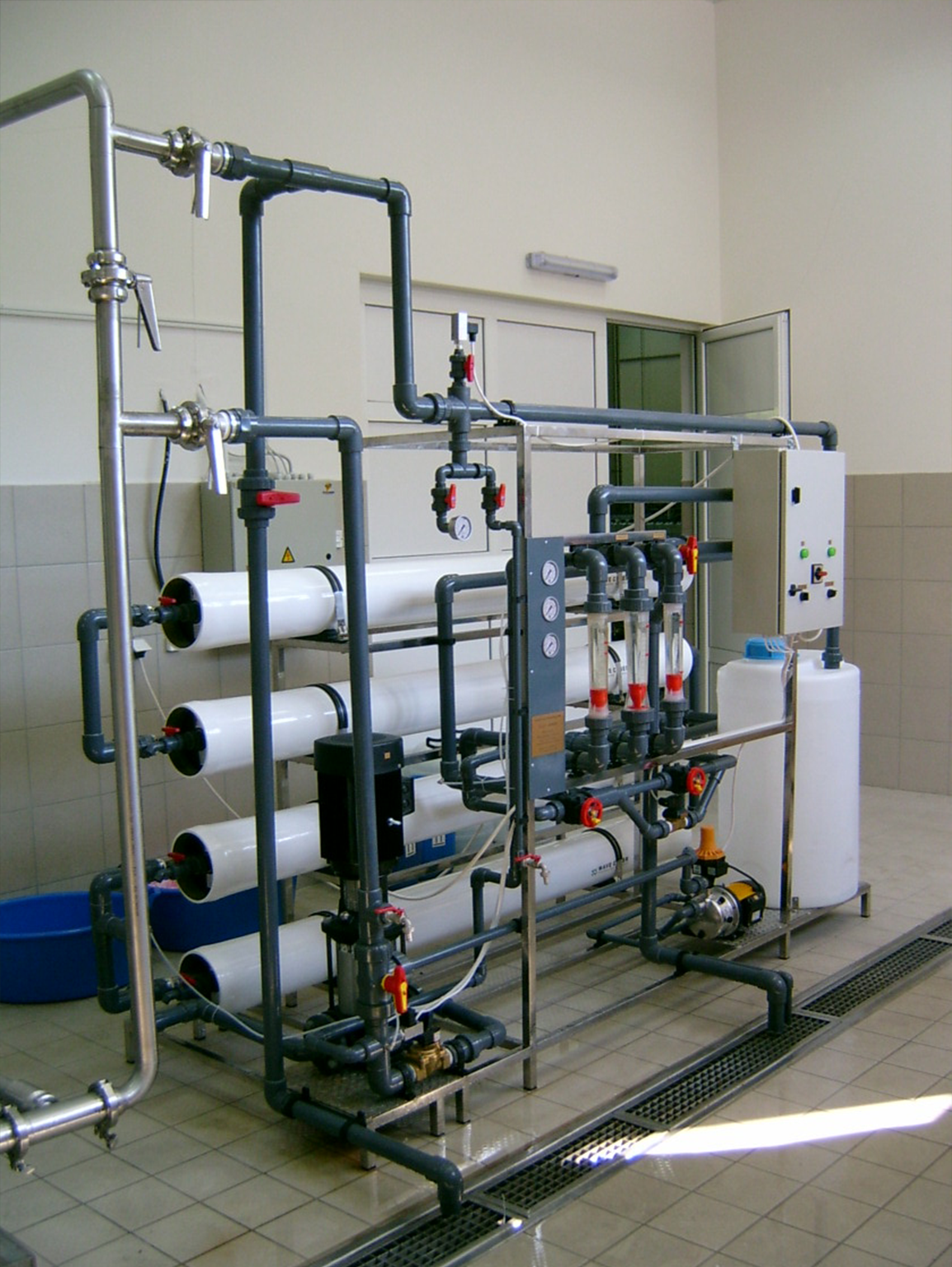 The spiral wound membranes operate on the next principle: After the pretreatment, raw water is being brought to the membrane housings containing semi-permeable spiral wound membrane elements by booster pump. Raw water is than passed through the membrane layers. In this step of the filtration, unwonted substances are being removed from the water creating waste water called – concentrate (retentate). Remaining part of the water presents clean water and it is called - permeate. Depending of the type of the membrane filtration wide range of unwonted substances can be removed from the raw water.